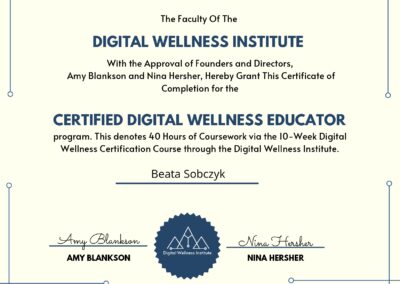 Jestem edukatorką rodziców, trenerką cyfrowej higieny. Pracuję w oparciu o Pozytywną Dyscyplinę, Self-Reg, Dialog Motywujący, #usłyszećnaczas.